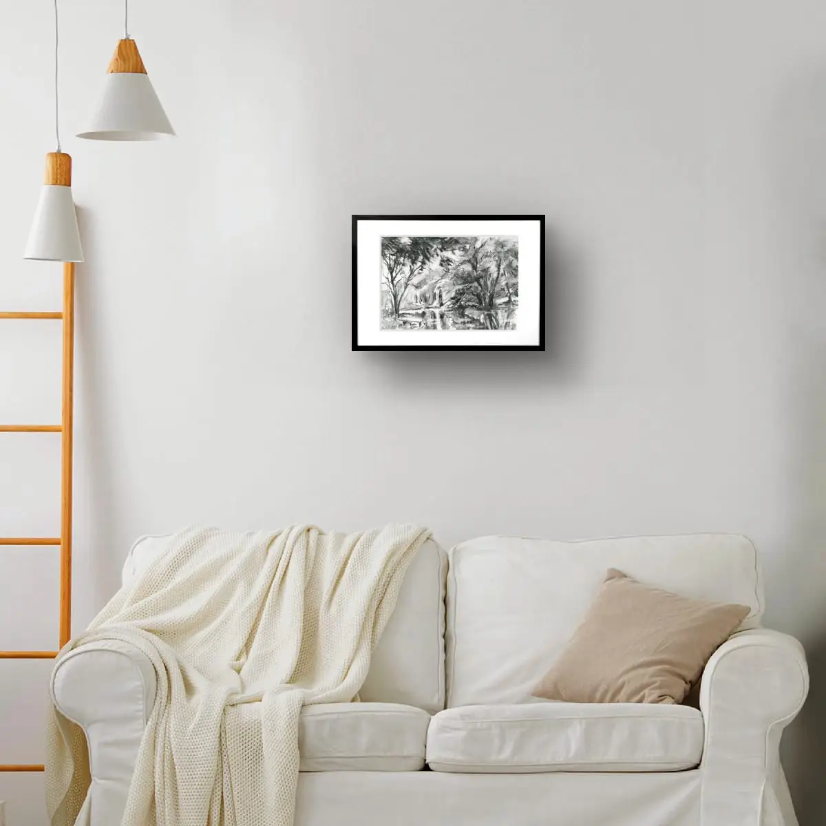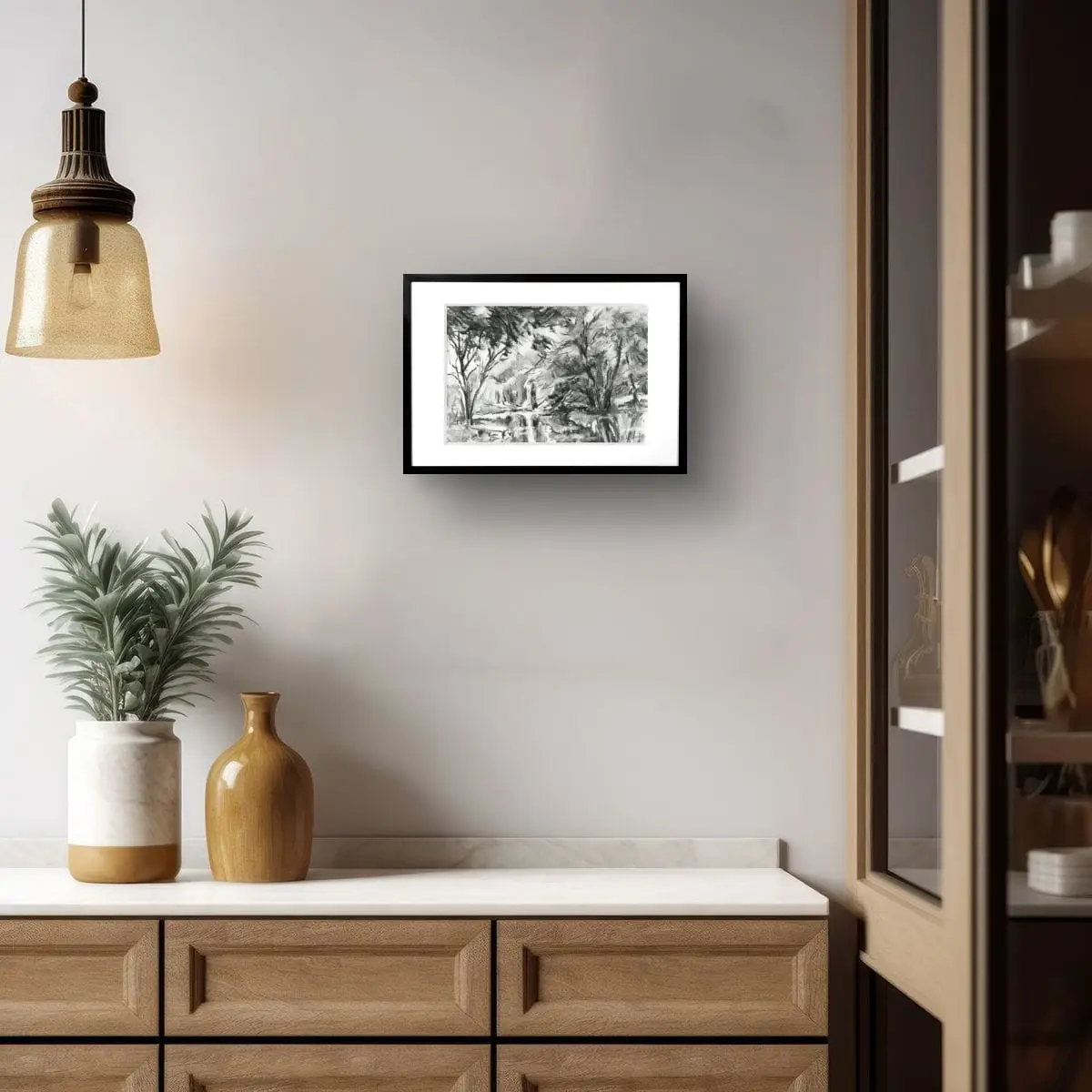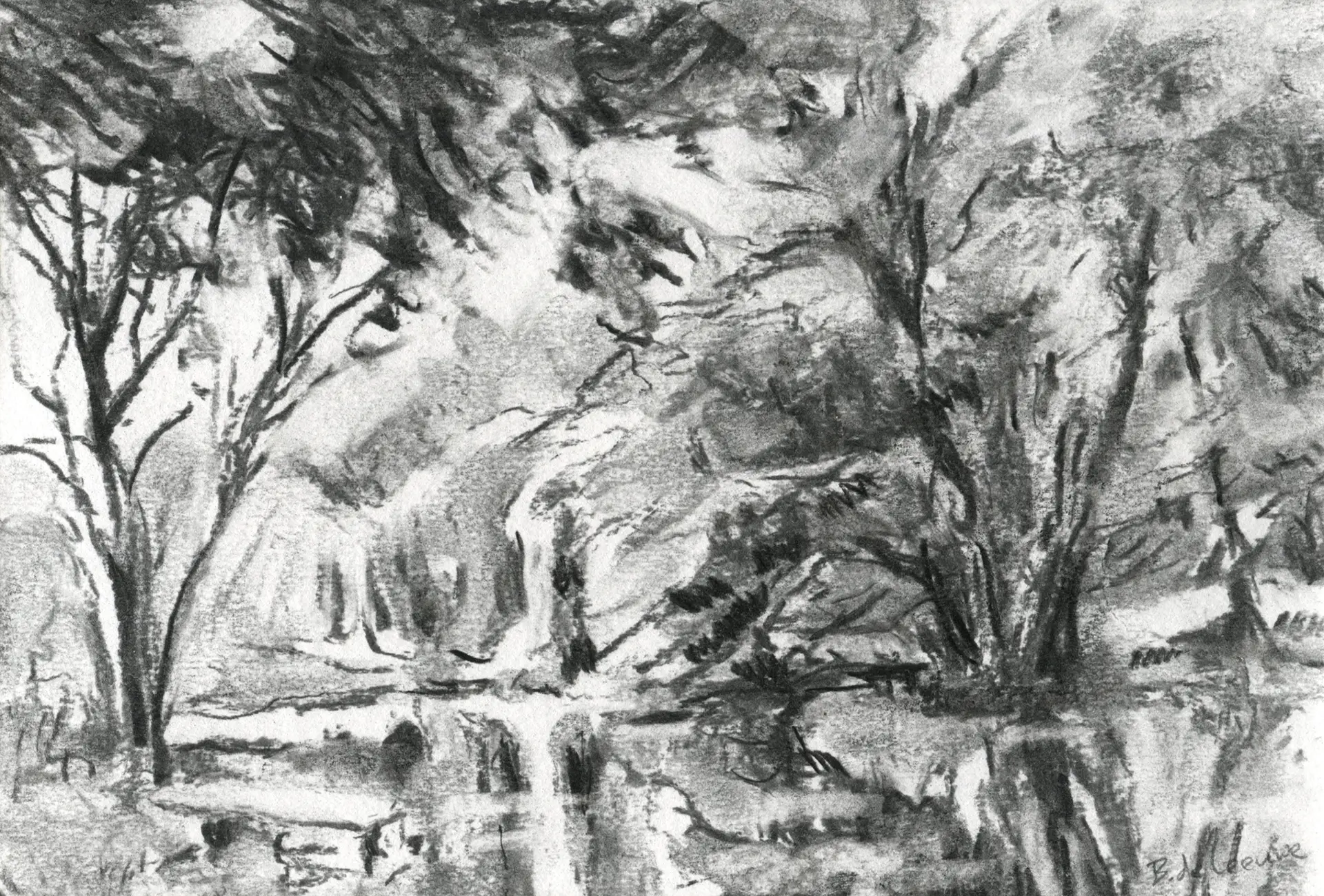 Schets Vijver – Belgische Ardennen | 21 × 29,7 cm | incl. lijst | Houtskool | 2022